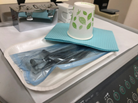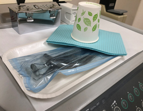 ゴム手袋、患者様用のコップ・エプロン等は、できる限り使い捨てのものを使用し、使い捨ての出来ない医療器具などは、特殊な機械を使用して滅菌を行っています。