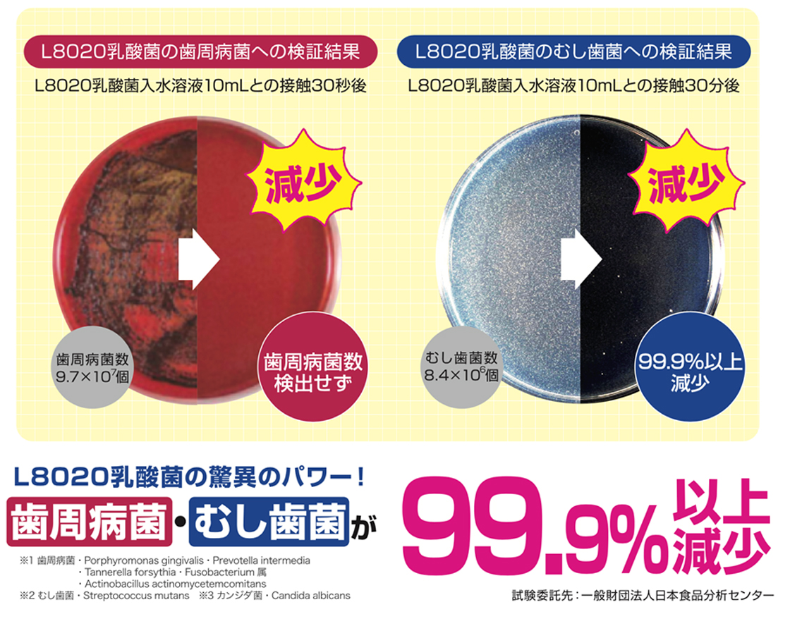 L8020乳酸菌とは歯周病、むし歯になったことのない健康な子どもの口の中から発見されたヒト由来の乳酸菌です。歯周病菌・むし歯菌の発育を阻止する、制菌効果のある乳酸菌の一種で、ヒトの口腔内から5種類の歯周病菌とむし歯菌・カンジダ菌を効果的に抑制し、口腔内環境を健康に保ちます。