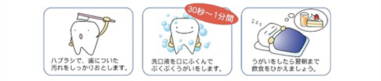 - フッ化物洗口は一日一回、寝る前の歯みがき後に行うのが効果的です。
