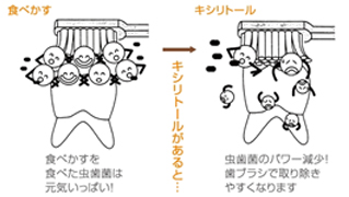 さらに、むし歯の原因となる歯垢や酸を作らず、むし歯の発生を防ぎます。