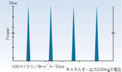 インパルスデンタルレーザーのパルス発振方式は、1パルスあたりのレーザー照射時間が非常に短く(1/10,000秒−100マイクロ秒)瞬間的な高いピークパルスで効果的に作用しながらも治療による痛みが非常に少なく、ほとんどの症例において麻酔を使わない治療が可能。